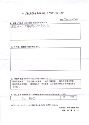 介護タクシーの開業相談から事業許可まで親切丁寧にアドバイスをして頂き、また、他のすでに開業されている方が依頼された行政書士さまより、低料金で確実的確な行動をして頂き本当にありがとうございました。